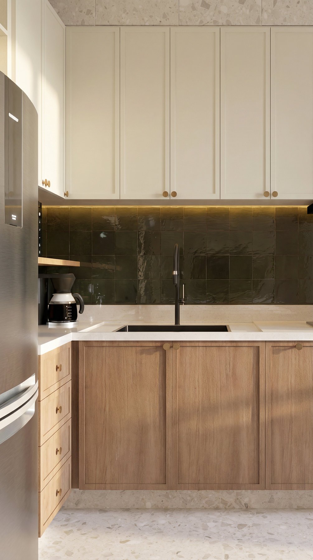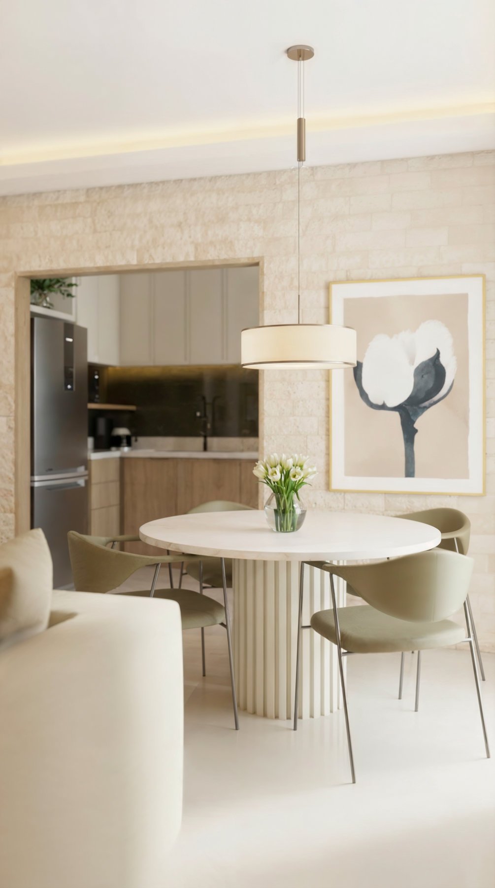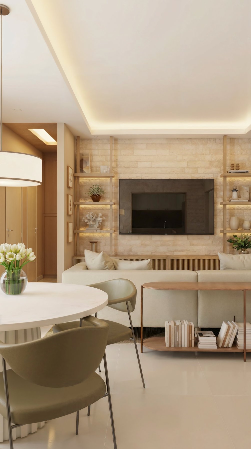 O projeto da sala e da cozinha da Casa 34 nasceu da inspiração nas cores da natureza, com o desejo de criar um ambiente calmo, acolhedor e cheio de personalidade. As pedras na parede, a madeira em tons quentes e o verde presente na paleta traduzem essa intenção de forma sensível e equilibrada.