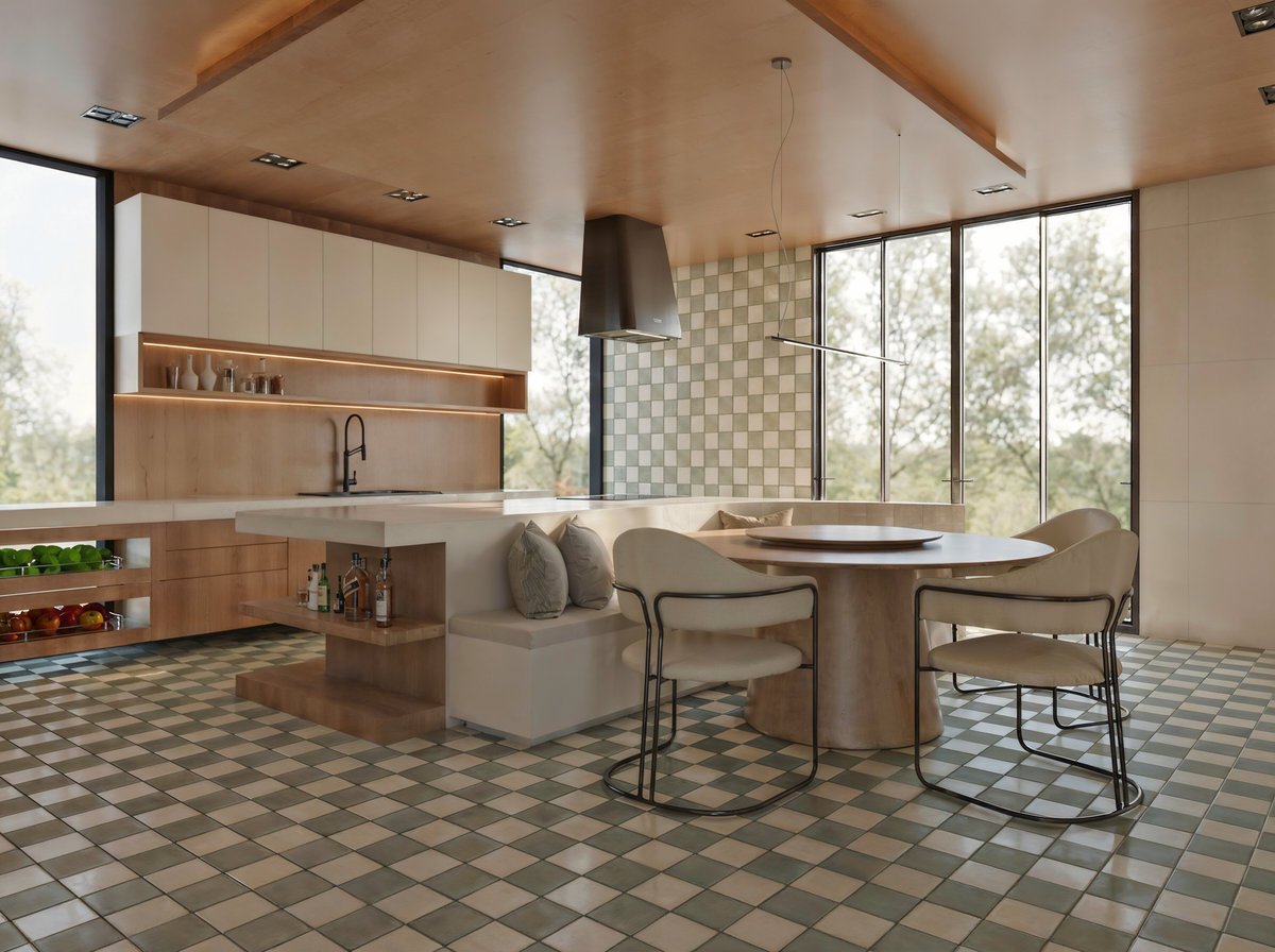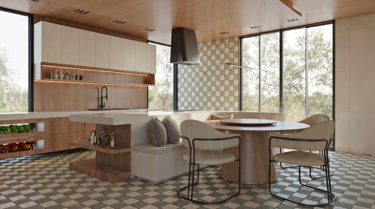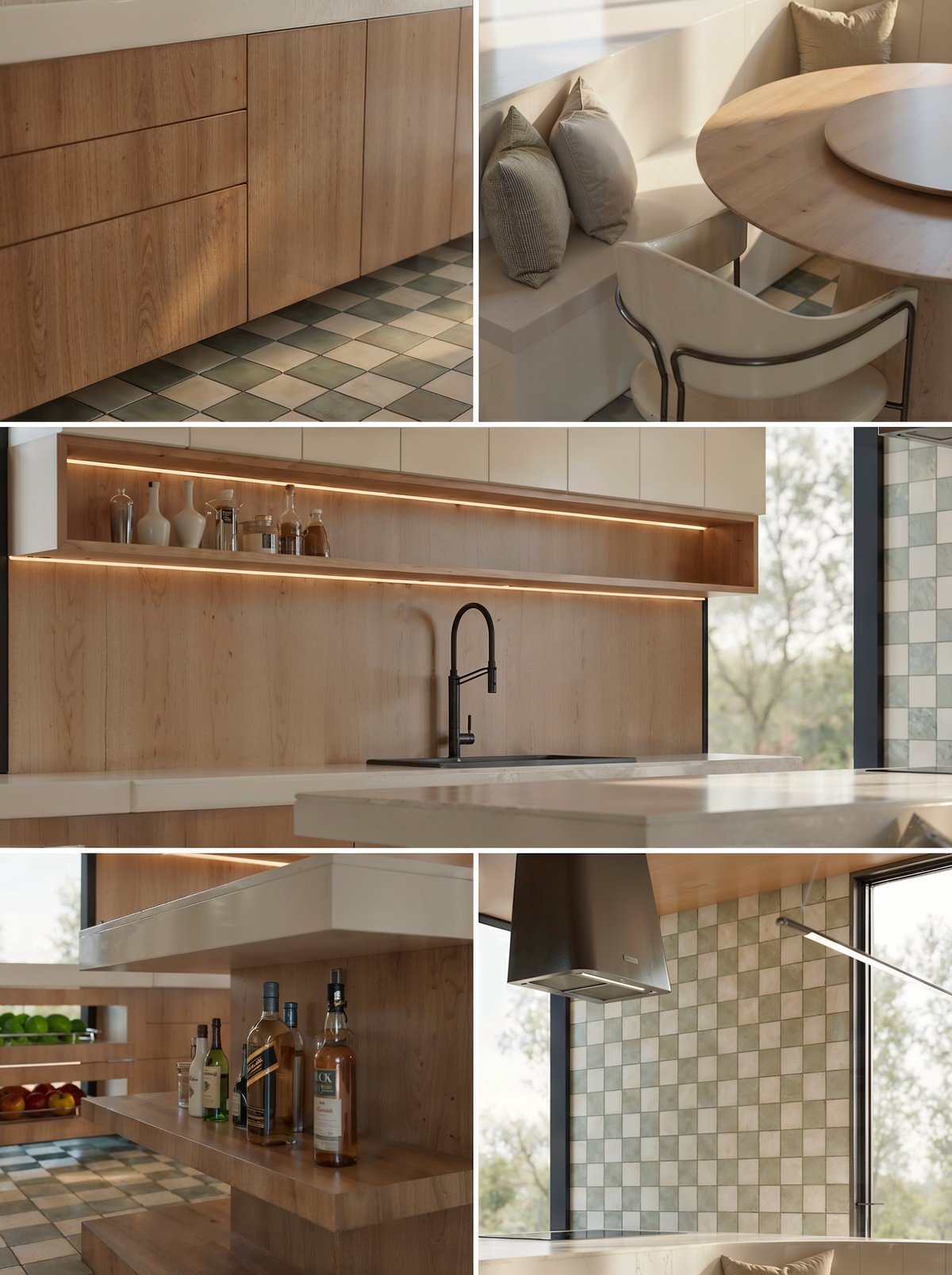 Cozinha Raiz Contemporânea – Este projeto nasce do encontro entre a simplicidade bem pensada e o aconchego dos materiais naturais. A madeira clara domina o espaço trazendo calor, textura e uma sensação imediata de acolhimento, enquanto os tons neutros e os revestimentos em paginação quadriculada reforçam uma estética atemporal, quase artesanal.
