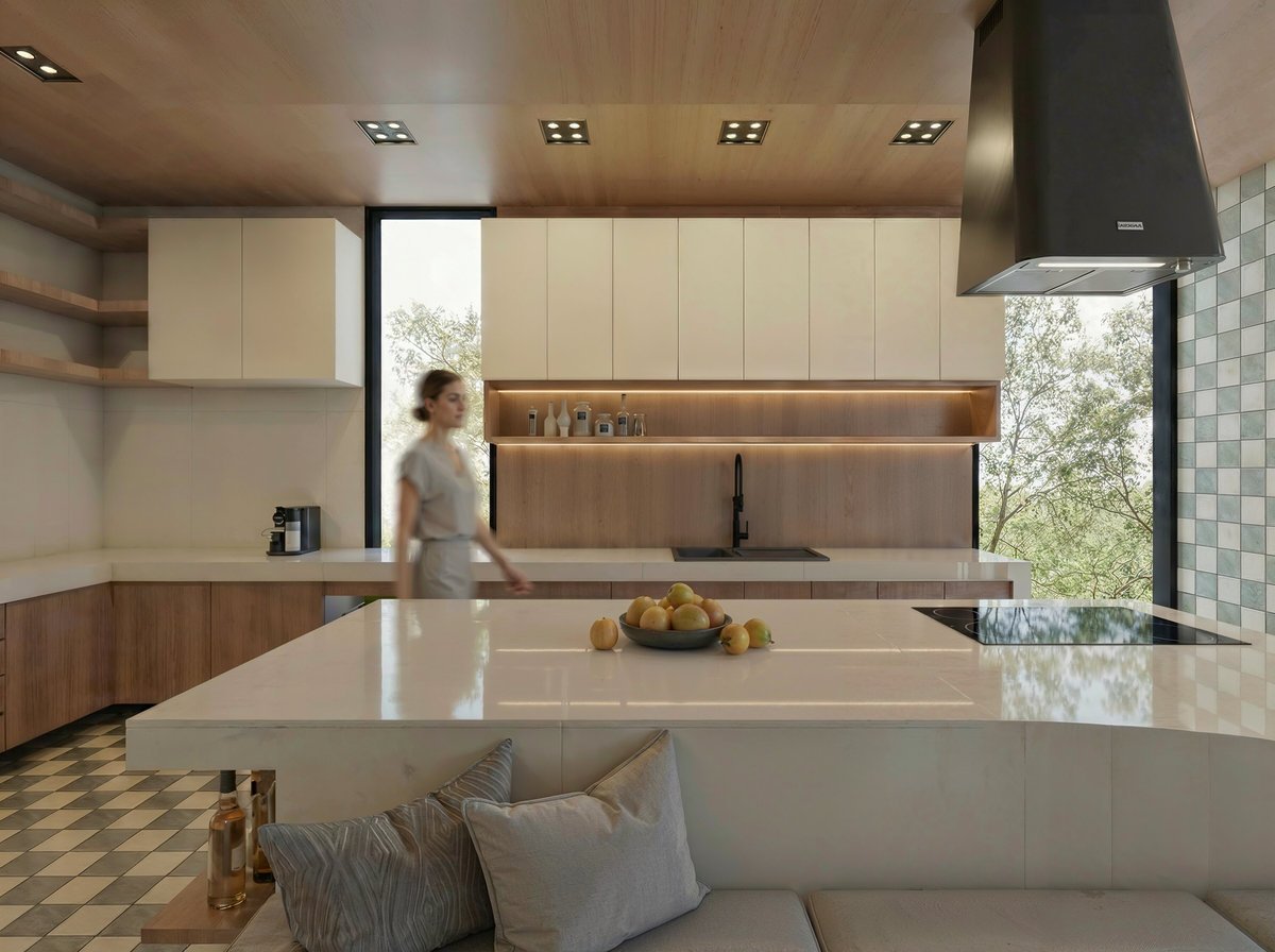 A cozinha foi desenhada para ser vivida: marcenaria limpa, com frentes contínuas e detalhes sutis, iluminação linear embutida que valoriza planos e profundidade, e uma ilha central que funciona como ponto de encontro — para cozinhar, conversar ou simplesmente estar. O banco integrado e a mesa redonda suavizam as linhas e convidam à permanência, criando um ambiente íntimo e fluido.