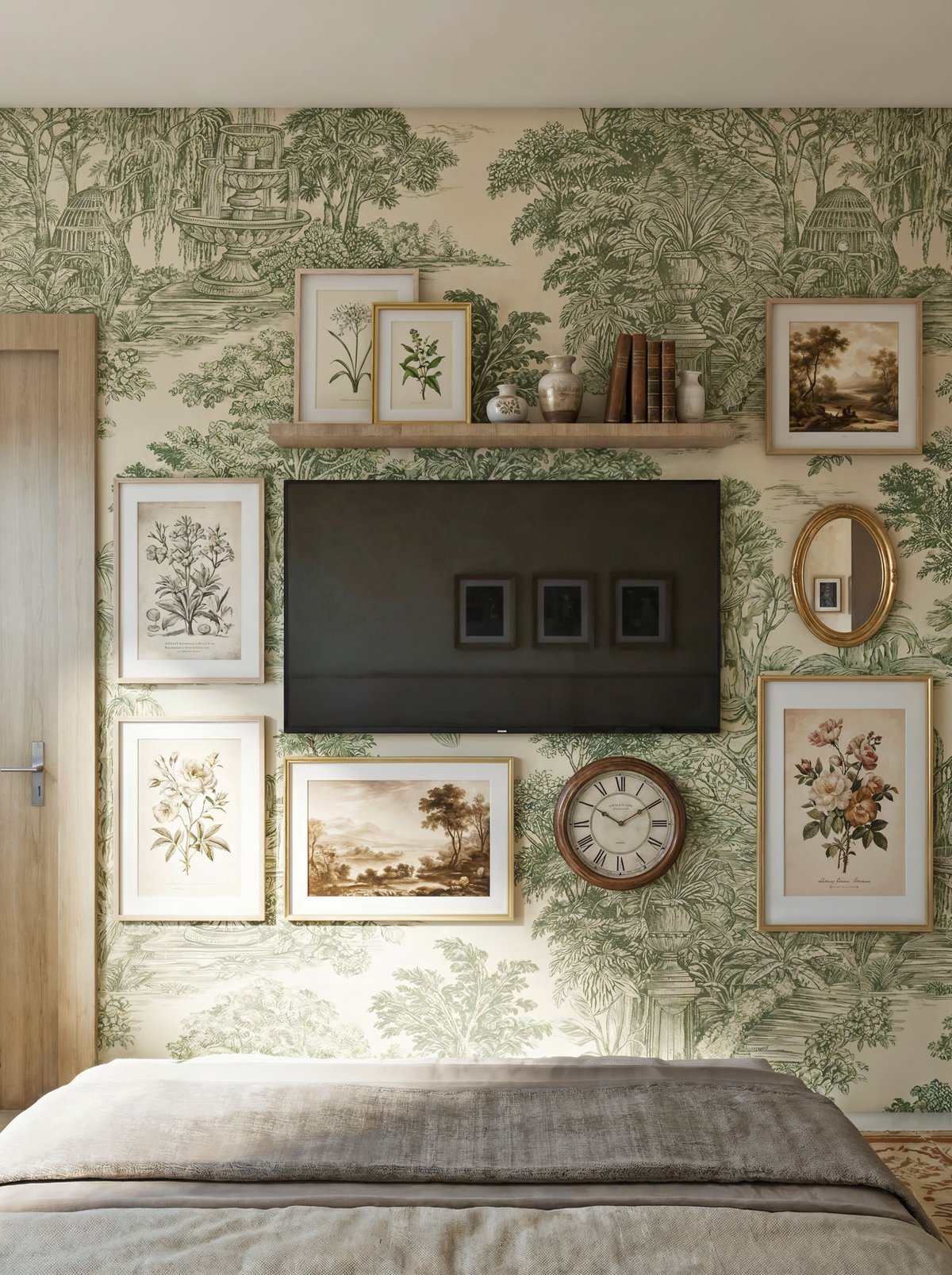 Na parede da TV, um mosaico de memórias ganha vida por meio de quadros, relógios, plantas e objetos especiais do casal, compondo uma decoração com intenção, significado e história.