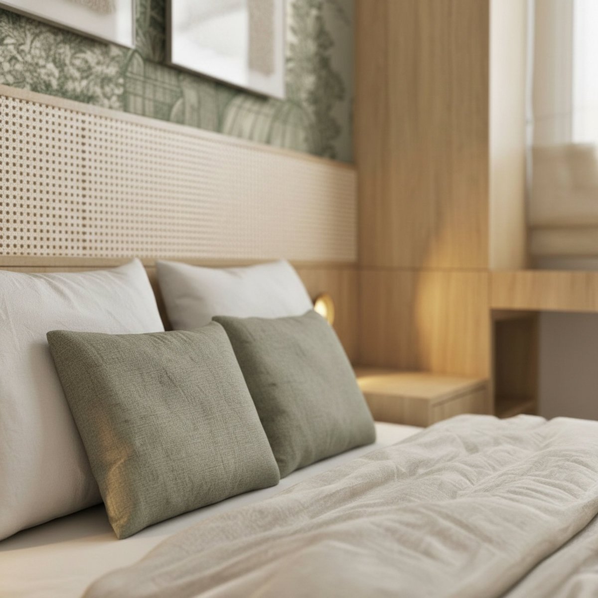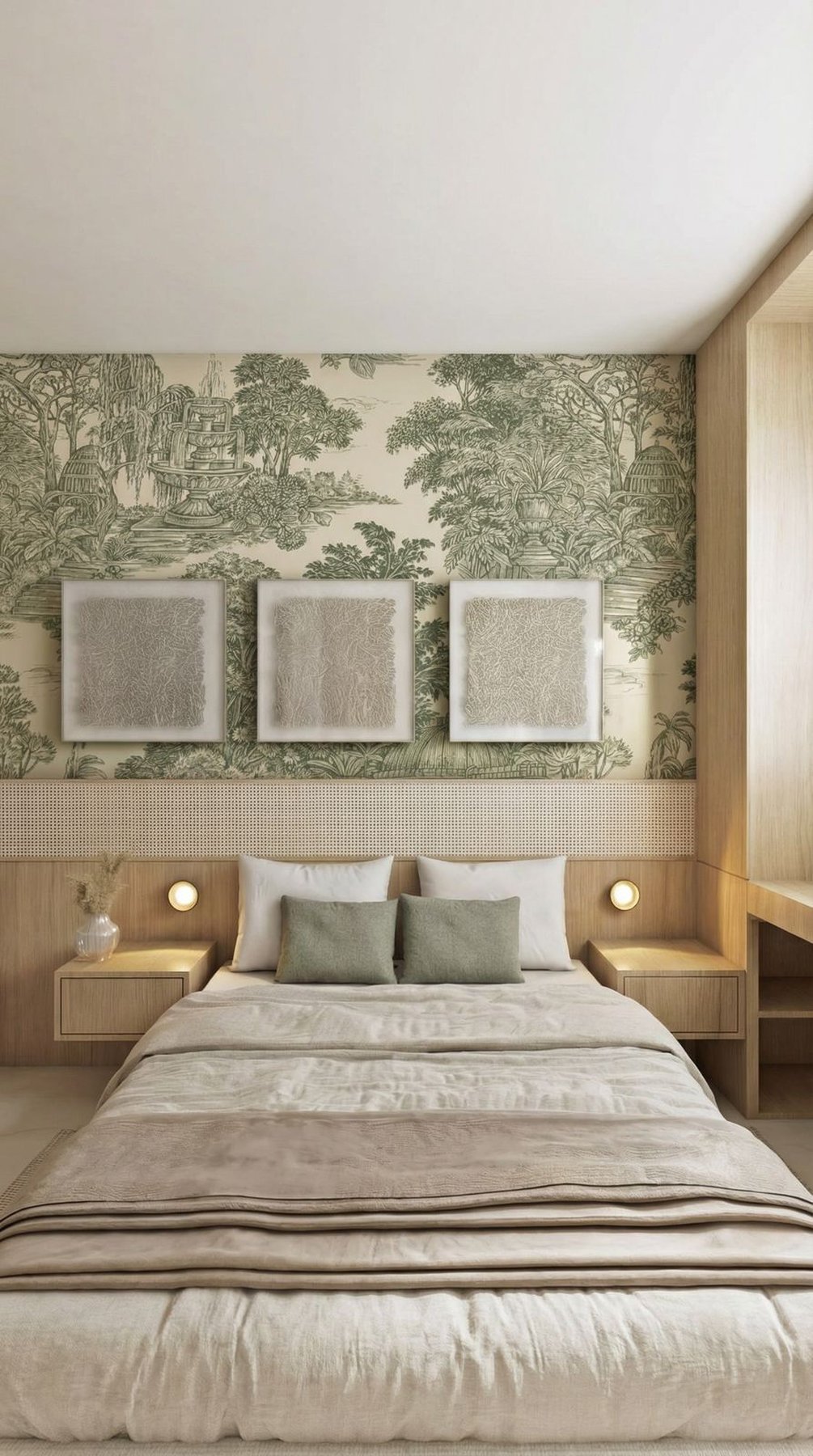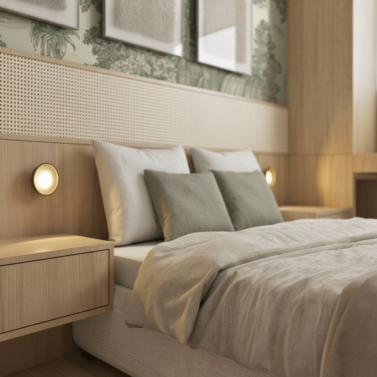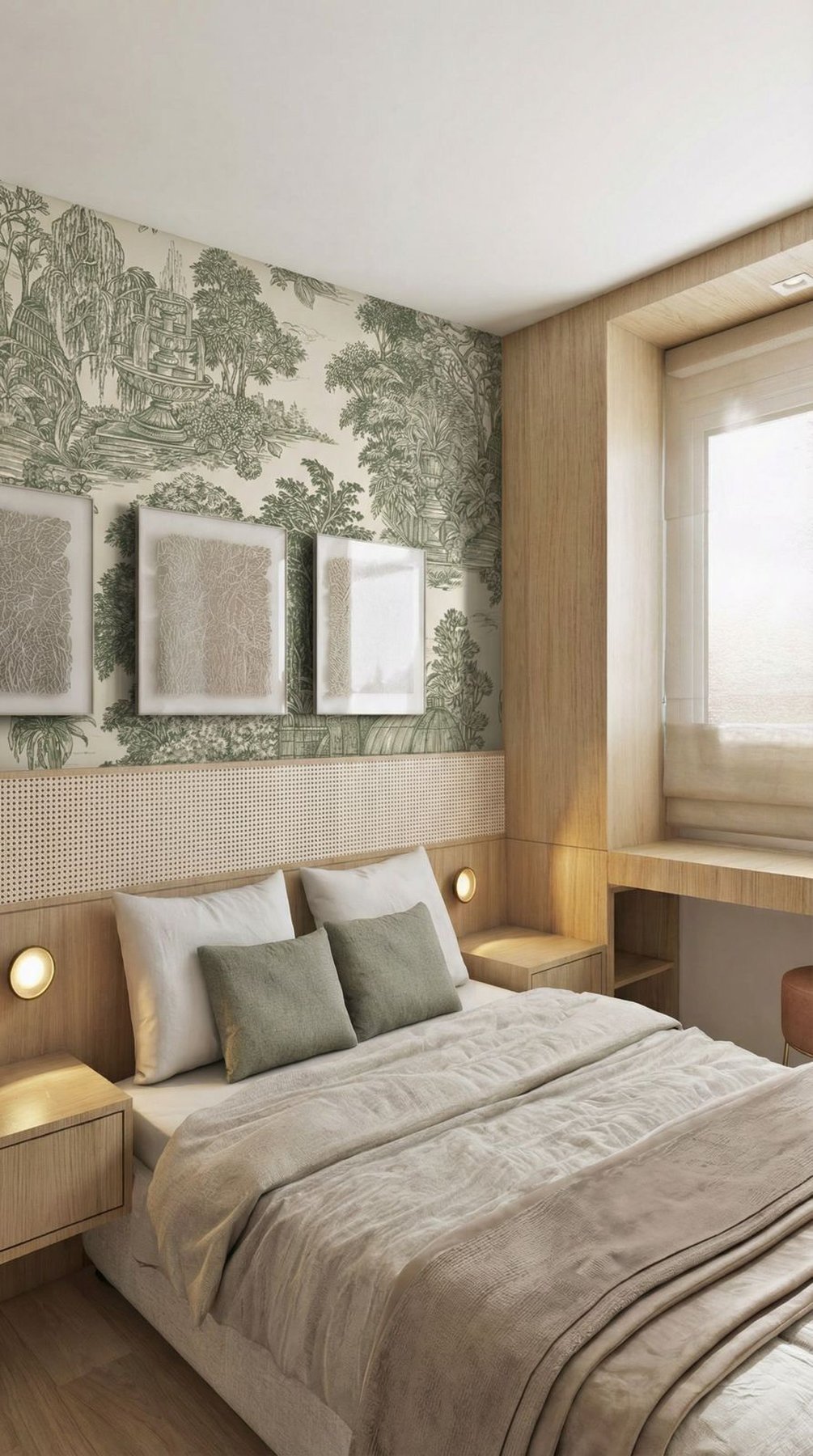 O quarto do casal da Casa 34 preserva a identidade presente em toda a casa. O verde permanece, trazendo cor e aconchego, agora revelado por meio do papel de parede — uma escolha carregada de afeto, que para a cliente a reconecta às lembranças da infância.